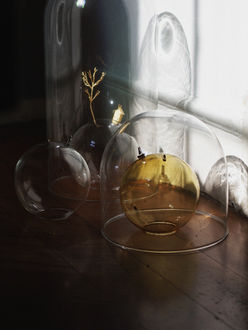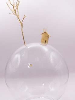 Série produzida manualmente em vidro e latão banhado a ouro e ródio branco, feito à mão, por meio de técnicas de joalheria de bancada.
